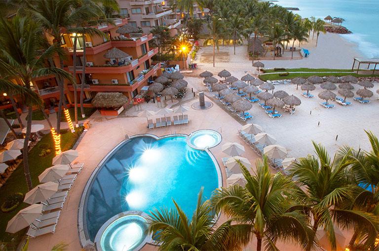 Attracting families and couples seeking a relaxed environment, the resort features a Spanish Colonial courtyard that opens to expansive grounds with flowering gardens, lawns and towering palm trees. Eight Hacienda-style buildings with terra-cotta tile roofs range from 4 to 8 stories. The centrepiece is the freeform activies pool containing a rock garden waterfall with waterslide. A quiet relaxing pool and oceanfront pool complete the main gardens of the resort.